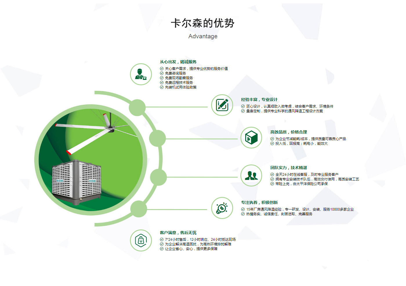 應用范圍: 適用于高溫或有異味的車間:熱處理廠、鑄件廠、塑料廠、鋁型材廠、制鞋廠、皮件廠、電鍍廠、印染廠等各種化工廠等。 適用于勞動密集型企業(yè):服裝廠,各類裝配車間,網吧等。 適用于需要降溫又需要一定濕度的場所:棉紡廠、毛紡廠、麻紡廠、織布廠、化纖廠、經編廠、加彈廠、針織廠、絲織廠、襪廠等各類紡織廠。 適用于:倉儲物流領域、園藝溫室大棚通風降溫、畜牧場降溫等場所。 全國服務熱線:13960350919